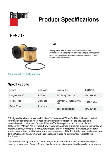 Fleetguard® FF5797 fuel filter cartridge reduces contamination, trapping dirt particles and preventing them from reaching the moving parts in your engine supporting longer service intervals.Specification