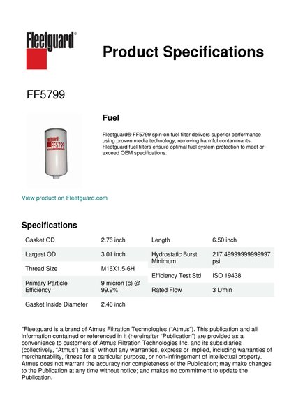 Fleetguard® FF5799 spin-on fuel filter delivers superior performance using proven media technology, removing harmful contaminants. Fleetguard fuel filters ensure optimal fuel system protection to meet or exceed OEM specifications.Specification