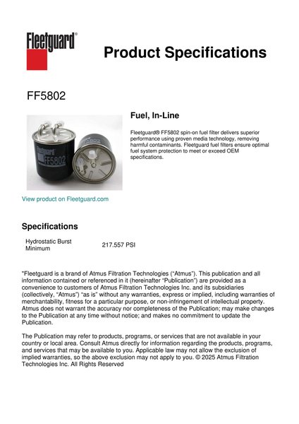 Fleetguard® FF5802 spin-on fuel filter delivers superior performance using proven media technology, removing harmful contaminants. Fleetguard fuel filters ensure optimal fuel system protection to meet or exceed OEM specifications.Specification