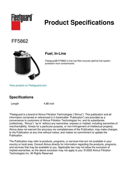Fleetguard® FF5862 in-line fuel filter ensures optimal fuel system protection from contaminants.Specification