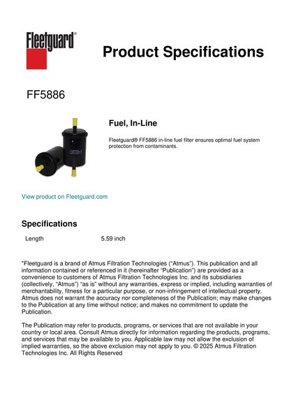 Fleetguard® FF5886 in-line fuel filter ensures optimal fuel system protection from contaminants.Specification
