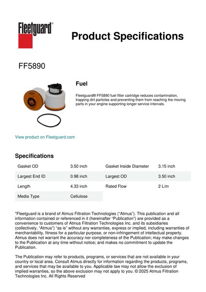 Fleetguard® FF5890 fuel filter cartridge reduces contamination, trapping dirt particles and preventing them from reaching the moving parts in your engine supporting longer service intervals.Specification