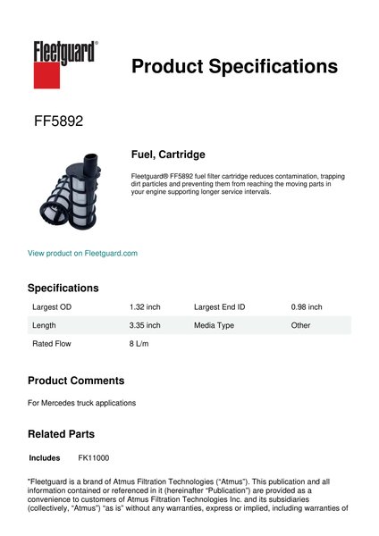 Fleetguard® FF5892 fuel filter cartridge reduces contamination, trapping dirt particles and preventing them from reaching the moving parts in your engine supporting longer service intervals.Specification