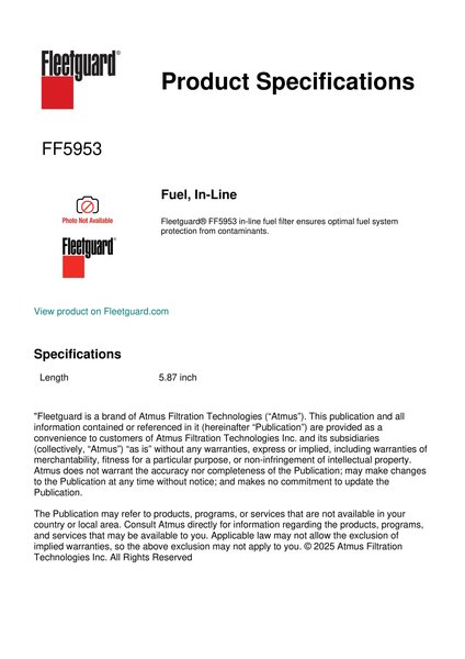 Fleetguard® FF5953 in-line fuel filter ensures optimal fuel system protection from contaminants.Specification