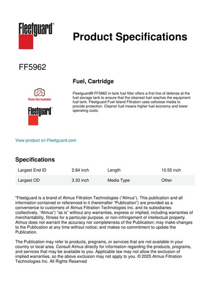 Fleetguard® FF5962 in-tank fuel filter offers a first line of defense at the fuel storage tank to ensure that the cleanest fuel reaches the equipment fuel tank. Fleetguard Fuel Island Filtration uses cellulose media to provide protection. Cleaner fuel means higher fuel economy and lower operating costs.Specification