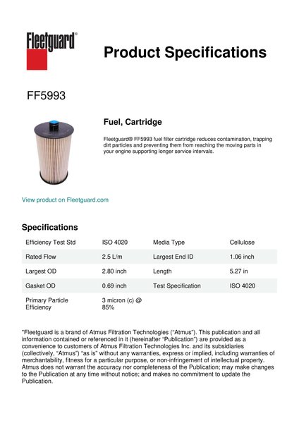 Fleetguard® FF5993 fuel filter cartridge reduces contamination, trapping dirt particles and preventing them from reaching the moving parts in your engine supporting longer service intervals.Specification