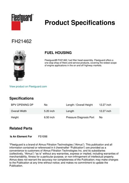 Fleetguard® FH21462, fuel filter head assembly. Fleetguard offers a one stop shop of filters and service products, covering the widest scope of engine applications in the on and off highway markets.Specification