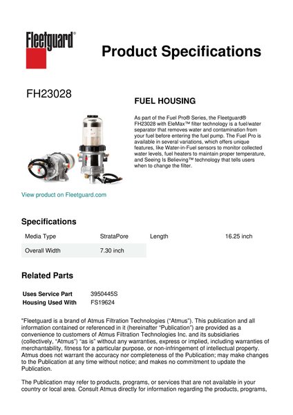 As part of the Fuel Pro® Series, the Fleetguard® FH23028 with EleMax™ filter technology is a fuel/water separator that removes water and contamination from your fuel before entering the fuel pump. The Fuel Pro is available in several variations, which offers unique features, like Water-in-Fuel sensors to monitor collected water levels, fuel heaters to maintain proper temperature, and Seeing Is Believing™ technology that tells users when to change the filter.Specification