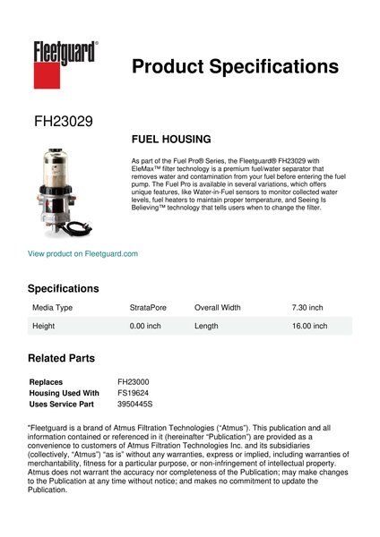 As part of the Fuel Pro® Series, the Fleetguard® FH23029 with EleMax™ filter technology is a premium fuel/water separator that removes water and contamination from your fuel before entering the fuel pump. The Fuel Pro is available in several variations, which offers unique features, like Water-in-Fuel sensors to monitor collected water levels, fuel heaters to maintain proper temperature, and Seeing Is Believing™ technology that tells users when to change the filter.Specification