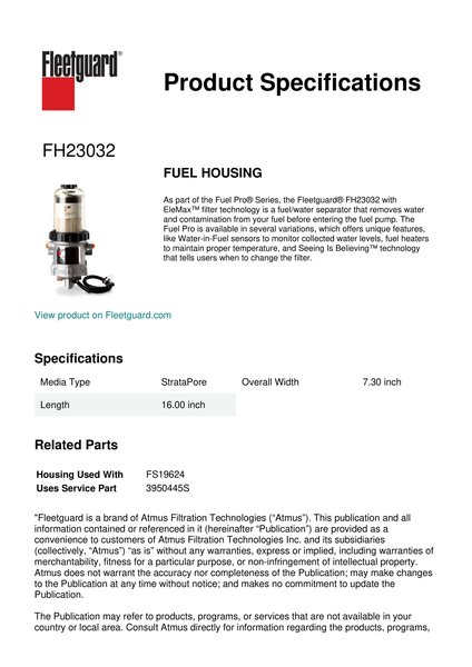 As part of the Fuel Pro® Series, the Fleetguard® FH23032 with EleMax™ filter technology is a fuel/water separator that removes water and contamination from your fuel before entering the fuel pump. The Fuel Pro is available in several variations, which offers unique features, like Water-in-Fuel sensors to monitor collected water levels, fuel heaters to maintain proper temperature, and Seeing Is Believing™ technology that tells users when to change the filter.Specification