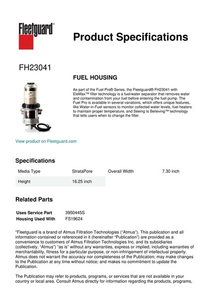 As part of the Fuel Pro® Series, the Fleetguard® FH23041 with EleMax™ filter technology is a fuel/water separator that removes water and contamination from your fuel before entering the fuel pump. The Fuel Pro is available in several variations, which offers unique features, like Water-in-Fuel sensors to monitor collected water levels, fuel heaters to maintain proper temperature, and Seeing Is Believing™ technology that tells users when to change the filter.Specification