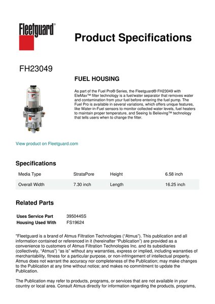 As part of the Fuel Pro® Series, the Fleetguard® FH23049 with EleMax™ filter technology is a fuel/water separator that removes water and contamination from your fuel before entering the fuel pump. The Fuel Pro is available in several variations, which offers unique features, like Water-in-Fuel sensors to monitor collected water levels, fuel heaters to maintain proper temperature, and Seeing Is Believing™ technology that tells users when to change the filter.Specification
