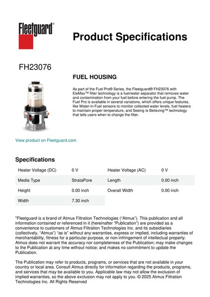 As part of the Fuel Pro® Series, the Fleetguard® FH23076 with EleMax™ filter technology is a fuel/water separator that removes water and contamination from your fuel before entering the fuel pump. The Fuel Pro is available in several variations, which offers unique features, like Water-in-Fuel sensors to monitor collected water levels, fuel heaters to maintain proper temperature, and Seeing Is Believing™ technology that tells users when to change the filter.Specification