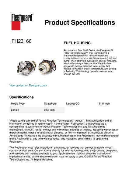 As part of the Fuel Pro® Series, the Fleetguard® FH23166 with EleMax™ filter technology is a fuel/water separator that removes water and contamination from your fuel before entering the fuel pump. The Fuel Pro is available in several variations, which offers unique features, like Water-in-Fuel sensors to monitor collected water levels, fuel heaters to maintain proper temperature, and Seeing Is Believing™ technology that tells users when to change the filter.Specification