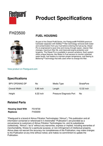 As part of the Diesel Pro® Series, the Fleetguard® FH23500 premium fuel/water separator with EleMax™ filter technology removes both water and contamination from your fuel before entering the fuel pump. Diesel Pro is engineered to save time and money through easier, cleaner filter changes, maximum filter life, and improved engine protection and longevity. The Diesel Pro is available in several variations. Each system offers unique features, like Water-in-Fuel sensors to monitor collected water levels, fuel heaters to maintain proper temperature, and Seeing Is Believing™ technology that tells users when to change the filter.Specification