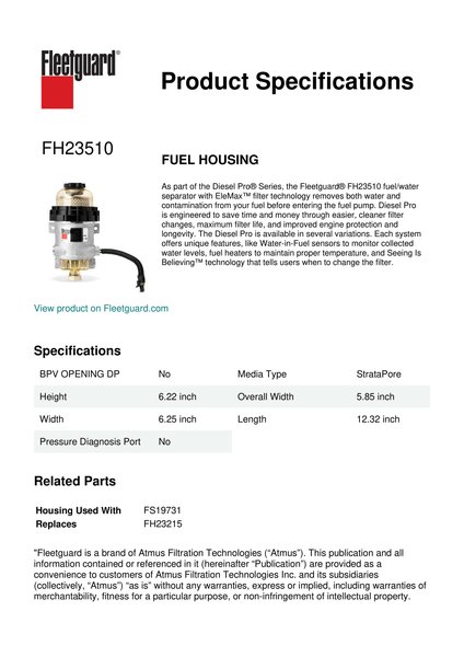 As part of the Diesel Pro® Series, the Fleetguard® FH23510 fuel/water separator with EleMax™ filter technology removes both water and contamination from your fuel before entering the fuel pump. Diesel Pro is engineered to save time and money through easier, cleaner filter changes, maximum filter life, and improved engine protection and longevity. The Diesel Pro is available in several variations. Each system offers unique features, like Water-in-Fuel sensors to monitor collected water levels, fuel heaters to maintain proper temperature, and Seeing Is Believing™ technology that tells users when to change the filter.Specification