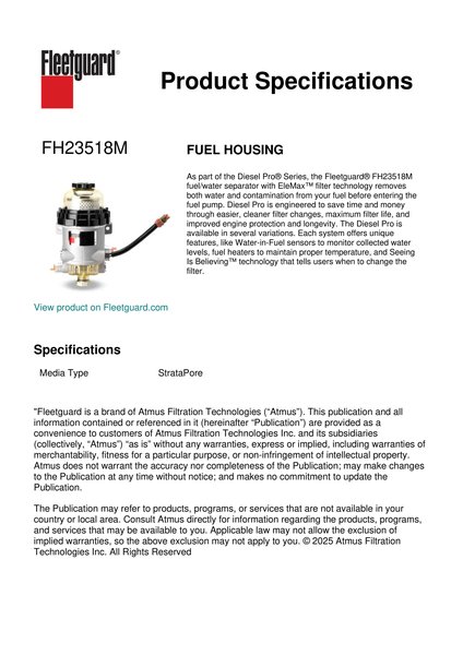 As part of the Diesel Pro® Series, the Fleetguard® FH23518M fuel/water separator with EleMax™ filter technology removes both water and contamination from your fuel before entering the fuel pump. Diesel Pro is engineered to save time and money through easier, cleaner filter changes, maximum filter life, and improved engine protection and longevity. The Diesel Pro is available in several variations. Each system offers unique features, like Water-in-Fuel sensors to monitor collected water levels, fuel heaters to maintain proper temperature, and Seeing Is Believing™ technology that tells users when to change the filter.Specification