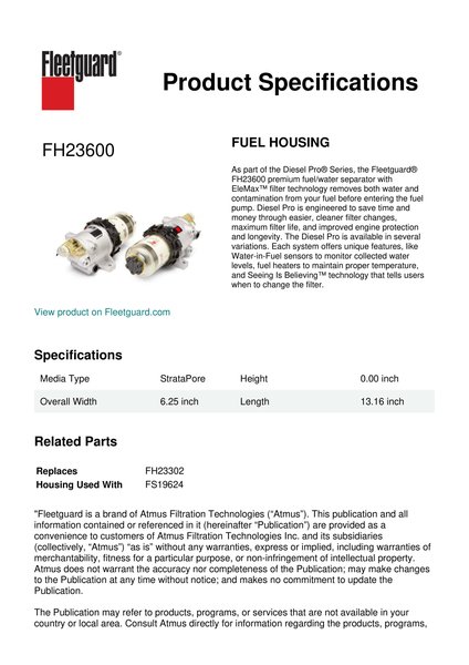 As part of the Diesel Pro® Series, the Fleetguard® FH23600 premium fuel/water separator with EleMax™ filter technology removes both water and contamination from your fuel before entering the fuel pump. Diesel Pro is engineered to save time and money through easier, cleaner filter changes, maximum filter life, and improved engine protection and longevity. The Diesel Pro is available in several variations. Each system offers unique features, like Water-in-Fuel sensors to monitor collected water levels, fuel heaters to maintain proper temperature, and Seeing Is Believing™ technology that tells users when to change the filter.Specification