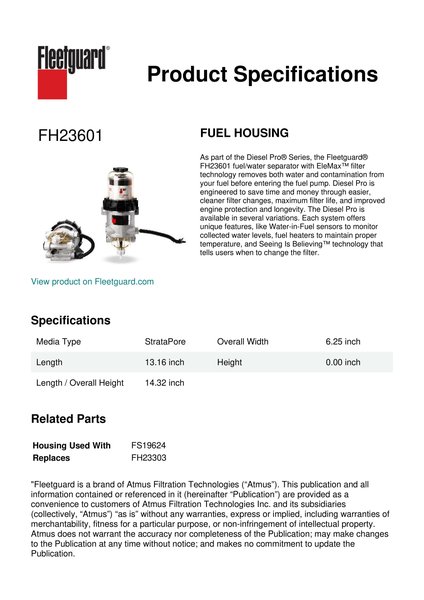 As part of the Diesel Pro® Series, the Fleetguard® FH23601 fuel/water separator with EleMax™ filter technology removes both water and contamination from your fuel before entering the fuel pump. Diesel Pro is engineered to save time and money through easier, cleaner filter changes, maximum filter life, and improved engine protection and longevity. The Diesel Pro is available in several variations. Each system offers unique features, like Water-in-Fuel sensors to monitor collected water levels, fuel heaters to maintain proper temperature, and Seeing Is Believing™ technology that tells users when to change the filter.Specification