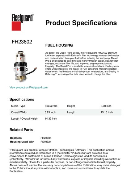 As part of the Diesel Pro® Series, the Fleetguard® FH23602 premium fuel/water separator with EleMax™ filter technology removes both water and contamination from your fuel before entering the fuel pump. Diesel Pro is engineered to save time and money through easier, cleaner filter changes, maximum filter life, and improved engine protection and longevity. The Diesel Pro is available in several variations. Each system offers unique features, like Water-in-Fuel sensors to monitor collected water levels, fuel heaters to maintain proper temperature, and Seeing Is Believing™ technology that tells users when to change the filter.Specification