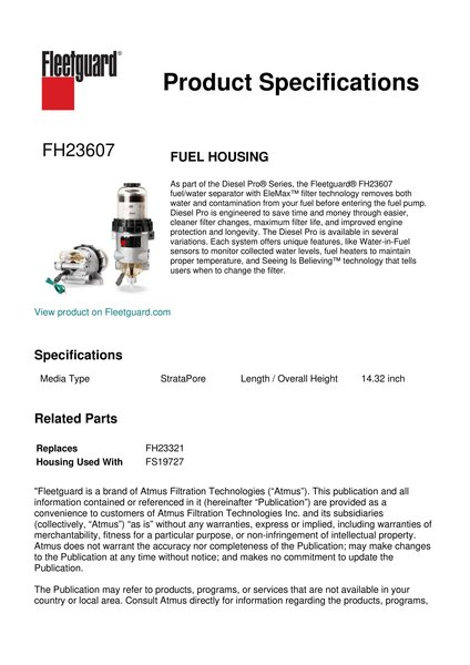 As part of the Diesel Pro® Series, the Fleetguard® FH23607 fuel/water separator with EleMax™ filter technology removes both water and contamination from your fuel before entering the fuel pump. Diesel Pro is engineered to save time and money through easier, cleaner filter changes, maximum filter life, and improved engine protection and longevity. The Diesel Pro is available in several variations. Each system offers unique features, like Water-in-Fuel sensors to monitor collected water levels, fuel heaters to maintain proper temperature, and Seeing Is Believing™ technology that tells users when to change the filter.Specification