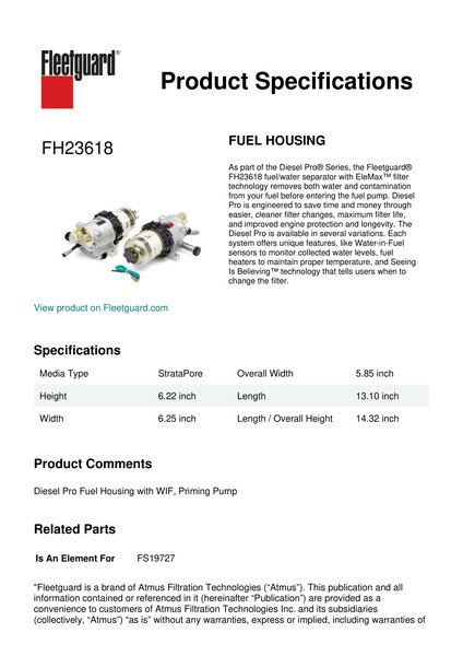 As part of the Diesel Pro® Series, the Fleetguard® FH23618 fuel/water separator with EleMax™ filter technology removes both water and contamination from your fuel before entering the fuel pump. Diesel Pro is engineered to save time and money through easier, cleaner filter changes, maximum filter life, and improved engine protection and longevity. The Diesel Pro is available in several variations. Each system offers unique features, like Water-in-Fuel sensors to monitor collected water levels, fuel heaters to maintain proper temperature, and Seeing Is Believing™ technology that tells users when to change the filter.Specification