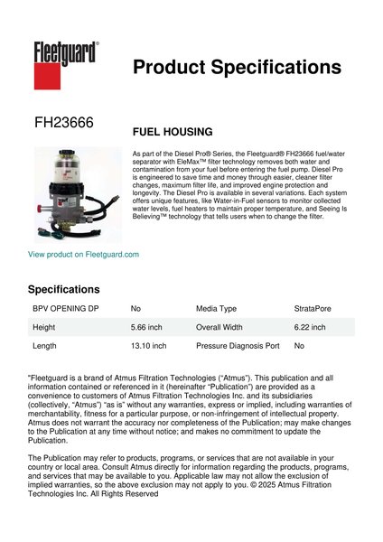 As part of the Diesel Pro® Series, the Fleetguard® FH23666 fuel/water separator with EleMax™ filter technology removes both water and contamination from your fuel before entering the fuel pump. Diesel Pro is engineered to save time and money through easier, cleaner filter changes, maximum filter life, and improved engine protection and longevity. The Diesel Pro is available in several variations. Each system offers unique features, like Water-in-Fuel sensors to monitor collected water levels, fuel heaters to maintain proper temperature, and Seeing Is Believing™ technology that tells users when to change the filter.Specification