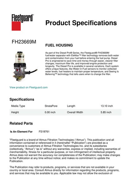 As part of the Diesel Pro® Series, the Fleetguard® FH23669M fuel/water separator with EleMax™ filter technology removes both water and contamination from your fuel before entering the fuel pump. Diesel Pro is engineered to save time and money through easier, cleaner filter changes, maximum filter life, and improved engine protection and longevity. The Diesel Pro is available in several variations. Each system offers unique features, like Water-in-Fuel sensors to monitor collected water levels, fuel heaters to maintain proper temperature, and Seeing Is Believing™ technology that tells users when to change the filter.Specification