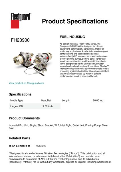 As part of Industrial Pro®FH239 series, the Fleetguard® FH23900 is designed for off-road equipment, construction, agricultural, mobile or stationary applications. Available in a wide range of configurations and specifications such as water-in-fuel (WIF) sensors, improved drain valves, electric priming pumps, priming ports, lighter cast aluminum construction, and low restriction check valve, designed to be the ultimate in fuel/water separation for diesel engines. It combines EleMax™ filter technology and multi-layered NanoNet® media, protecting against shorter filter life and potential fuel system damage caused by water or particle contamination found in poor-quality fuel.Specification