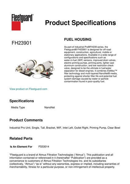 As part of Industrial Pro®FH239 series, the Fleetguard® FH23901 is designed for off-road equipment, construction, agricultural, mobile or stationary applications. Available in a wide range of configurations and specifications such as water-in-fuel (WIF) sensors, improved drain valves, electric priming pumps, priming ports, lighter cast aluminum construction, and low restriction check valve, designed to be the ultimate in fuel/water separation for diesel engines. It combines EleMax™ filter technology and multi-layered NanoNet® media, protecting against shorter filter life and potential fuel system damage caused by water or particle contamination found in poor-quality fuel.Specification