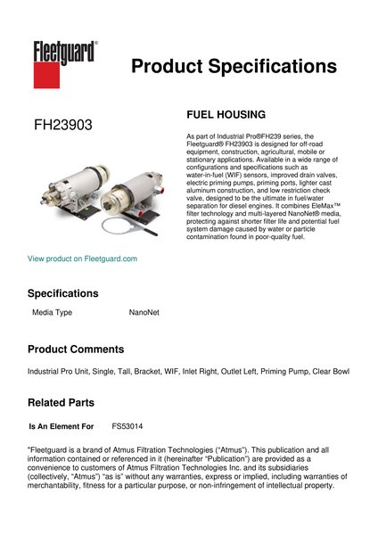 As part of Industrial Pro®FH239 series, the Fleetguard® FH23903 is designed for off-road equipment, construction, agricultural, mobile or stationary applications. Available in a wide range of configurations and specifications such as water-in-fuel (WIF) sensors, improved drain valves, electric priming pumps, priming ports, lighter cast aluminum construction, and low restriction check valve, designed to be the ultimate in fuel/water separation for diesel engines. It combines EleMax™ filter technology and multi-layered NanoNet® media, protecting against shorter filter life and potential fuel system damage caused by water or particle contamination found in poor-quality fuel.Specification