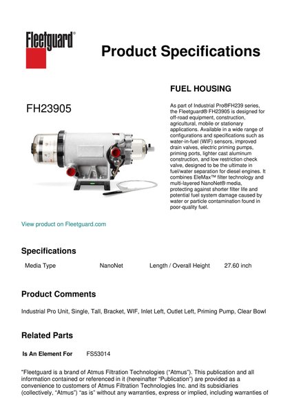 As part of Industrial Pro®FH239 series, the Fleetguard® FH23905 is designed for off-road equipment, construction, agricultural, mobile or stationary applications. Available in a wide range of configurations and specifications such as water-in-fuel (WIF) sensors, improved drain valves, electric priming pumps, priming ports, lighter cast aluminum construction, and low restriction check valve, designed to be the ultimate in fuel/water separation for diesel engines. It combines EleMax™ filter technology and multi-layered NanoNet® media, protecting against shorter filter life and potential fuel system damage caused by water or particle contamination found in poor-quality fuel.Specification