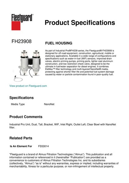 As part of Industrial Pro®FH239 series, the Fleetguard® FH23908 is designed for off-road equipment, construction, agricultural, mobile or stationary applications. Available in a wide range of configurations and specifications such as water-in-fuel (WIF) sensors, improved drain valves, electric priming pumps, priming ports, lighter cast aluminum construction, and low restriction check valve, designed to be the ultimate in fuel/water separation for diesel engines. It combines EleMax™ filter technology and multi-layered NanoNet® media, protecting against shorter filter life and potential fuel system damage caused by water or particle contamination found in poor-quality fuel.Specification