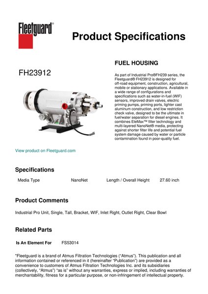 As part of Industrial Pro®FH239 series, the Fleetguard® FH23912 is designed for off-road equipment, construction, agricultural, mobile or stationary applications. Available in a wide range of configurations and specifications such as water-in-fuel (WIF) sensors, improved drain valves, electric priming pumps, priming ports, lighter cast aluminum construction, and low restriction check valve, designed to be the ultimate in fuel/water separation for diesel engines. It combines EleMax™ filter technology and multi-layered NanoNet® media, protecting against shorter filter life and potential fuel system damage caused by water or particle contamination found in poor-quality fuel.Specification