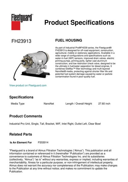 As part of Industrial Pro®FH239 series, the Fleetguard® FH23913 is designed for off-road equipment, construction, agricultural, mobile or stationary applications. Available in a wide range of configurations and specifications such as water-in-fuel (WIF) sensors, improved drain valves, electric priming pumps, priming ports, lighter cast aluminum construction, and low restriction check valve, designed to be the ultimate in fuel/water separation for diesel engines. It combines EleMax™ filter technology and multi-layered NanoNet® media, protecting against shorter filter life and potential fuel system damage caused by water or particle contamination found in poor-quality fuel.Specification