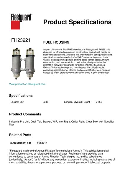 As part of Industrial Pro®FH239 series, the Fleetguard® FH23921 is designed for off-road equipment, construction, agricultural, mobile or stationary applications. Available in a wide range of configurations and specifications such as water-in-fuel (WIF) sensors, improved drain valves, electric priming pumps, priming ports, lighter cast aluminum construction, and low restriction check valve, designed to be the ultimate in fuel/water separation for diesel engines. It combines EleMax™ filter technology and multi-layered NanoNet® media, protecting against shorter filter life and potential fuel system damage caused by water or particle contamination found in poor-quality fuel.Specification