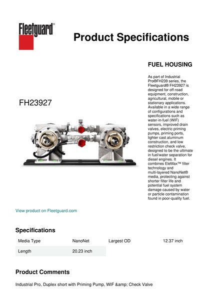 As part of Industrial Pro®FH239 series, the Fleetguard® FH23927 is designed for off-road equipment, construction, agricultural, mobile or stationary applications. Available in a wide range of configurations and specifications such as water-in-fuel (WIF) sensors, improved drain valves, electric priming pumps, priming ports, lighter cast aluminum construction, and low restriction check valve, designed to be the ultimate in fuel/water separation for diesel engines. It combines EleMax™ filter technology and multi-layered NanoNet® media, protecting against shorter filter life and potential fuel system damage caused by water or particle contamination found in poor-quality fuel.Specification