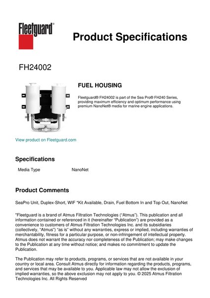 Fleetguard® FH24002 is part of the Sea Pro® FH240 Series, providing maximum efficiency and optimum performance using premium NanoNet® media for marine engine applications.Specification