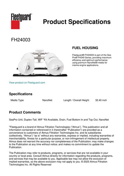 Fleetguard® FH24003 is part of the Sea Pro® FH240 Series, providing maximum efficiency and optimum performance using premium NanoNet® media for marine engine applications.Specification