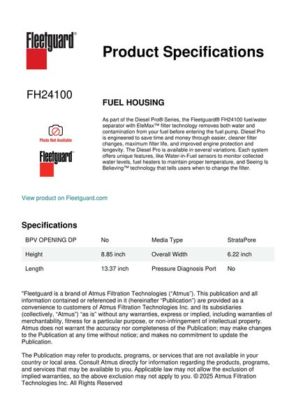 As part of the Diesel Pro® Series, the Fleetguard® FH24100 fuel/water separator with EleMax™ filter technology removes both water and contamination from your fuel before entering the fuel pump. Diesel Pro is engineered to save time and money through easier, cleaner filter changes, maximum filter life, and improved engine protection and longevity. The Diesel Pro is available in several variations. Each system offers unique features, like Water-in-Fuel sensors to monitor collected water levels, fuel heaters to maintain proper temperature, and Seeing Is Believing™ technology that tells users when to change the filter.Specification