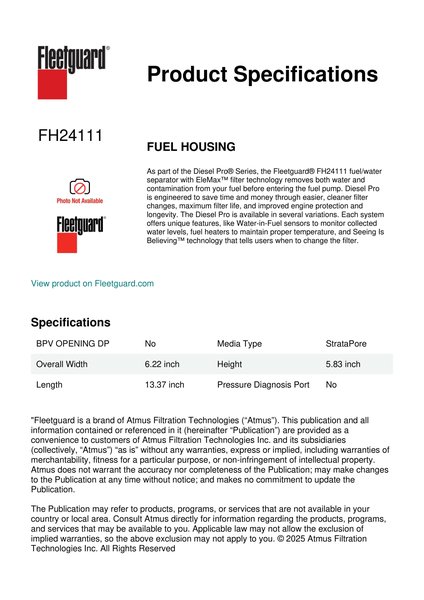 As part of the Diesel Pro® Series, the Fleetguard® FH24111 fuel/water separator with EleMax™ filter technology removes both water and contamination from your fuel before entering the fuel pump. Diesel Pro is engineered to save time and money through easier, cleaner filter changes, maximum filter life, and improved engine protection and longevity. The Diesel Pro is available in several variations. Each system offers unique features, like Water-in-Fuel sensors to monitor collected water levels, fuel heaters to maintain proper temperature, and Seeing Is Believing™ technology that tells users when to change the filter.Specification