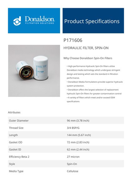 Genuine Donaldson P171606 Hydraulic Filter, Spin-On provides dependable protection for hydraulic systems by efficiently removing particulates and contaminants. It ensures clean hydraulic fluid, promoting smooth operation and extending the lifespan of critical system components.