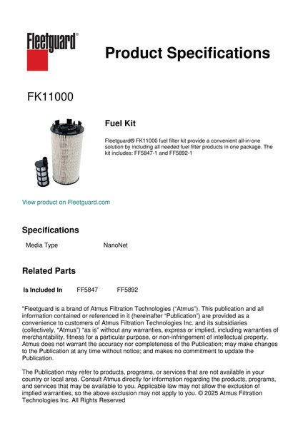 Fleetguard® FK11000 fuel filter kit provide a convenient all-in-one solution by including all needed fuel filter products in one package. The kit includes: FF5847-1 and FF5892-1Specification
