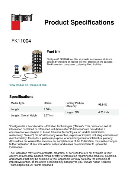 Fleetguard® FK11004 fuel filter kit provide a convenient all-in-one solution by including all needed fuel filter products in one package. The kit contains: pre-screen, coalescing filter, final filter.Specification