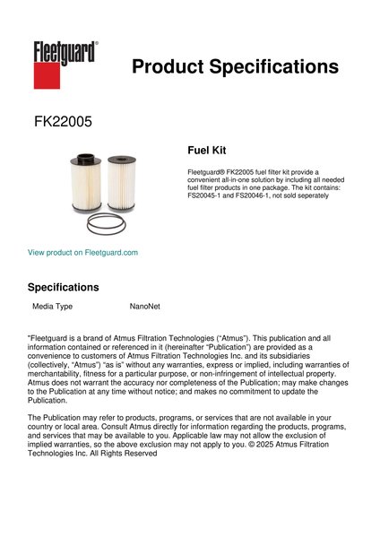 Fleetguard® FK22005 fuel filter kit provide a convenient all-in-one solution by including all needed fuel filter products in one package. The kit contains: FS20045-1 and FS20046-1, not sold seperatelySpecification