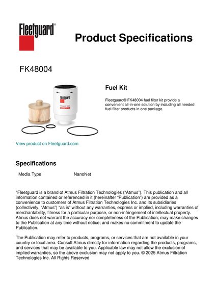 Fleetguard® FK48004 fuel filter kit provide a convenient all-in-one solution by including all needed fuel filter products in one package.Specification