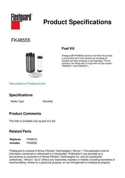 Fleetguard® FK48555 premium fuel filter kit provide a convenient all-in-one solution by including all needed fuel filter products in one package. The kit contains: two filters with O-rings with no pre-screen: FS20034-1 and FS20035-1.Specification