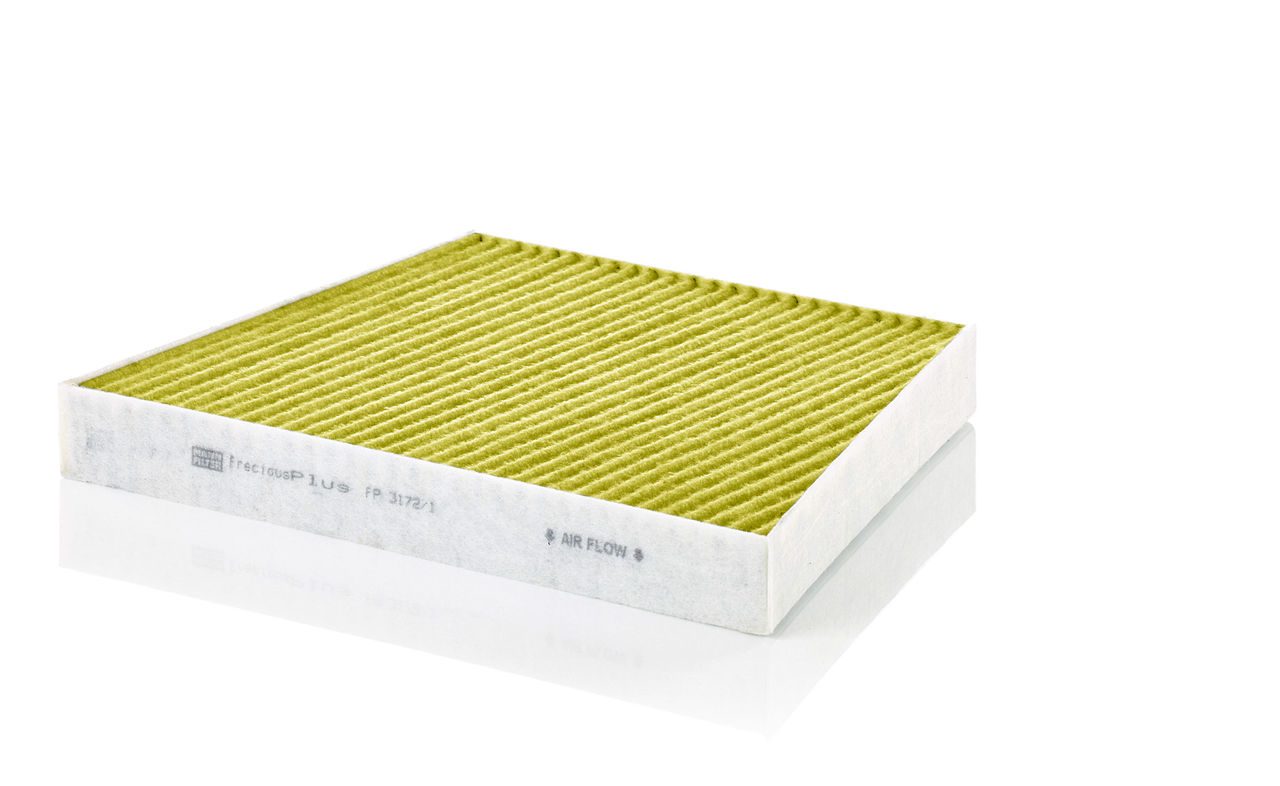 Biofunctional MANN-FILTER FreciousPlus cabin air filters - nearly 100% protection against nitrogen oxides, dust, allergens and mould - harmful gases and unpleasant odours are also eliminated and virus aerosols filtered. The three-layer filter technology absorbs almost 100% of allergens, reduces the growth of molds and bacteria by more than 98% and stops fine dust almost completely.
