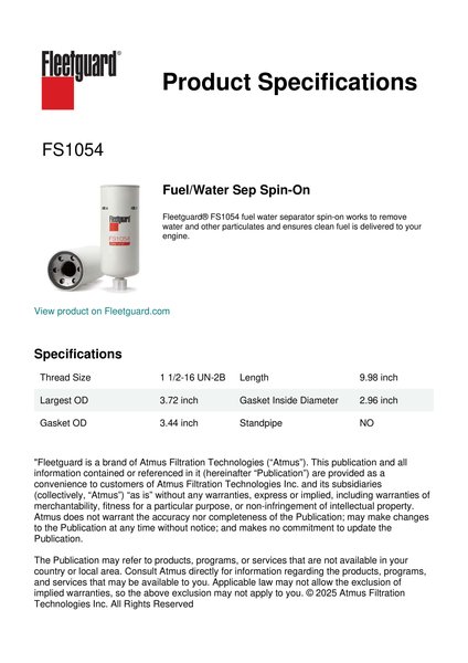 Fleetguard® FS1054 fuel water separator spin-on works to remove water and other particulates and ensures clean fuel is delivered to your engine.Specification
