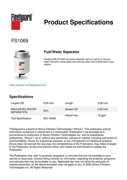 Fleetguard® FS1069 fuel water separator spin-on works to remove water and other particulates and ensures clean fuel is delivered to your engine.Specification